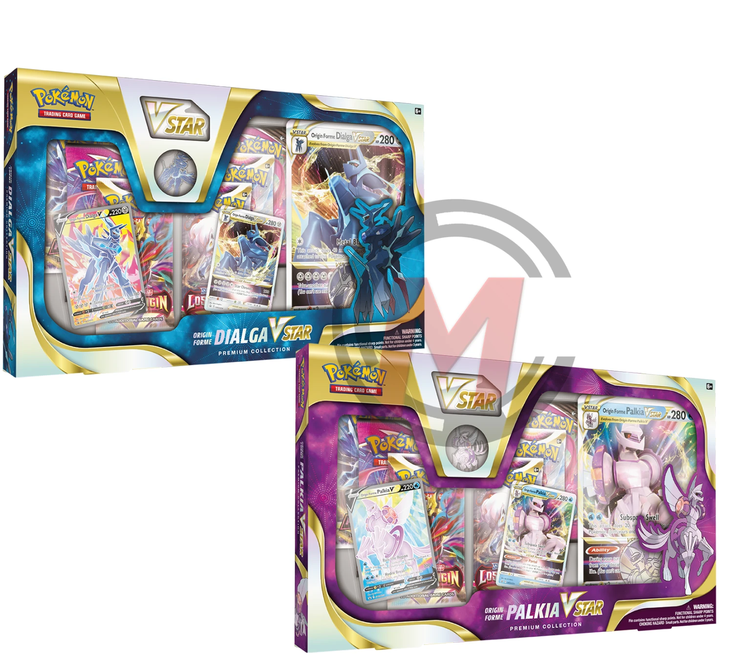 Origin Forme Dialga VSTAR wields colossal strength to bend time to its will, while Origin Forme Palkia VSTAR soars across the sky and twists the fabric of space! Appearing here in both playable and oversize versions, each ancient Legendary Pokémon boasts a potentially game-changing VSTAR Power. To round out this deluxe collection, the star Pokémon also appears as a Pokémon V, metal pin, and shimmering coin!